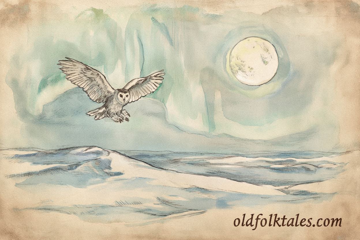 That night, Owl flew higher than she had ever flown before. Her wings carried her above the mountains, over the frozen rivers, and into the realm where the aurora shimmered like flowing ribbons of light. There, beyond the edge of the sky, lived the Great Spirit who watched over all living things.
